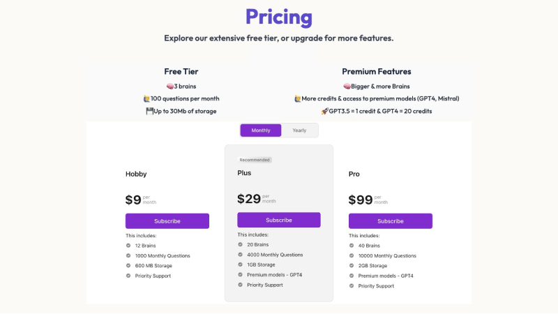 - Hobby版:9美元每月,构建12个知识库、每月1000个问题、600Mb存储空间