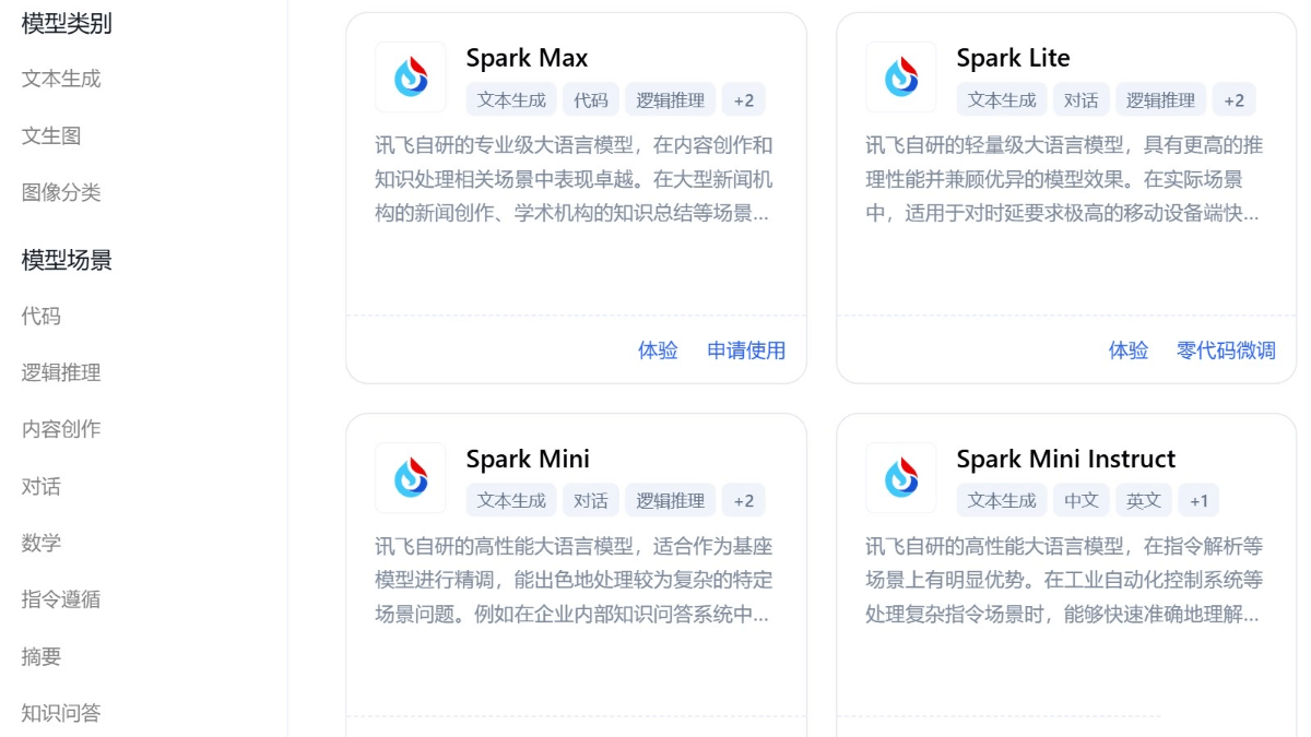 - 新增模型:新增Spark Max、Spark Mini、Spark Tiny等星火自研模型,适应不同业务场景需求。