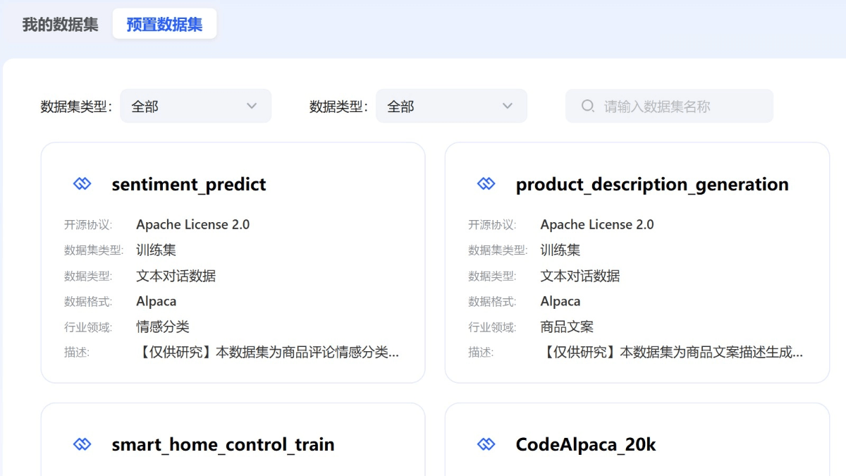 - 数据准备:准备或选择适合的数据集进行微调。平台支持多种数据集格式,提供数据增强等工具帮助构建高质量数据集。