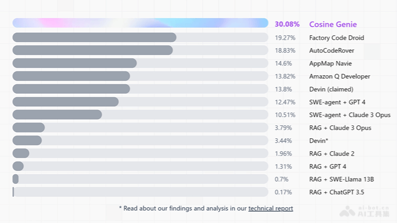 - 专有数据集:Genie用Cosine AI专有技术生成的数据进行训练,包括成果分析、静态分析等方法及自我改进机制。