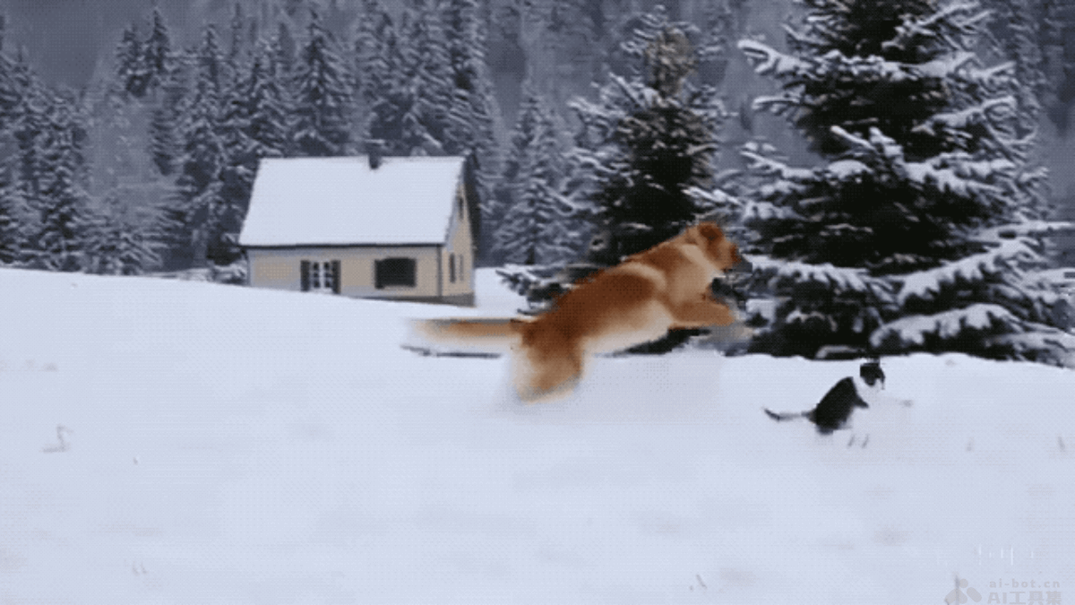 - 腾讯混元文生视频:一只金毛寻回犬在白雪皑皑的德国追逐一只猫。