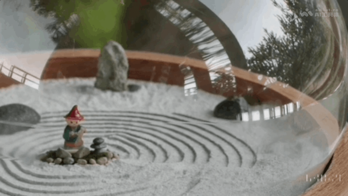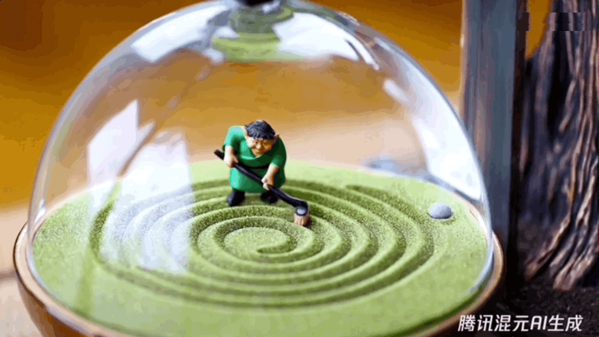 - 腾讯混元文生视频:一个特写镜头,展示了一个内部有禅宗花园的玻璃球。球中有一个小矮人,正在耙禅宗花园并在沙子中创造图案。