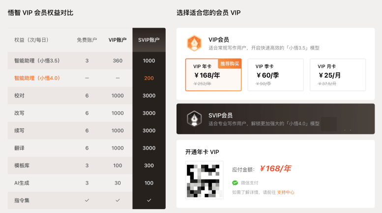 • VIP会员:每日可使用小悟3.5智能助理360次;每日校对、改写、续写、翻译各1000次;每日使用模板库100次、AI生成30次