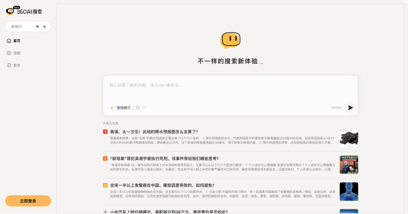 - 增强模式:在增强模式下,360AI搜索会进行更深层次的语义分析,通过追问来获取更多细节信息,然后将问题拆分为多个关键词,进行更广泛的搜索。这有助于系统更准确地理解复杂问题,并提供更详细的答案。