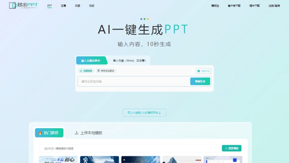 - 输入或上传内容: 在首页的输入框中输入主题或要求,或者直接导入需要生成PPT的文本,如Word文档等。