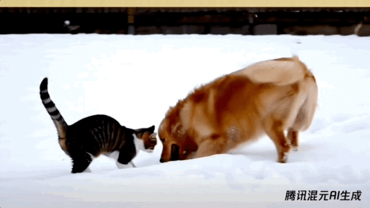 - 腾讯混元文生视频:一只金毛寻回犬在白雪皑皑的德国追逐一只猫。